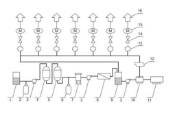 上 圖結(jié)構(gòu)示意圖中1為原水箱、2為聚合氯化鋁加藥裝置、3為增壓泵、4為多介質(zhì)過濾器、5為活性炭過濾器、6為阻垢劑加藥裝置、7為精密過濾器、8為膜分離裝置、9為凈水箱、10為消毒器、11為灌裝機(jī)、12為全自動(dòng)變頻控制器、13為儲(chǔ)水器、14為閥門、15為電機(jī)、16為用戶單元。